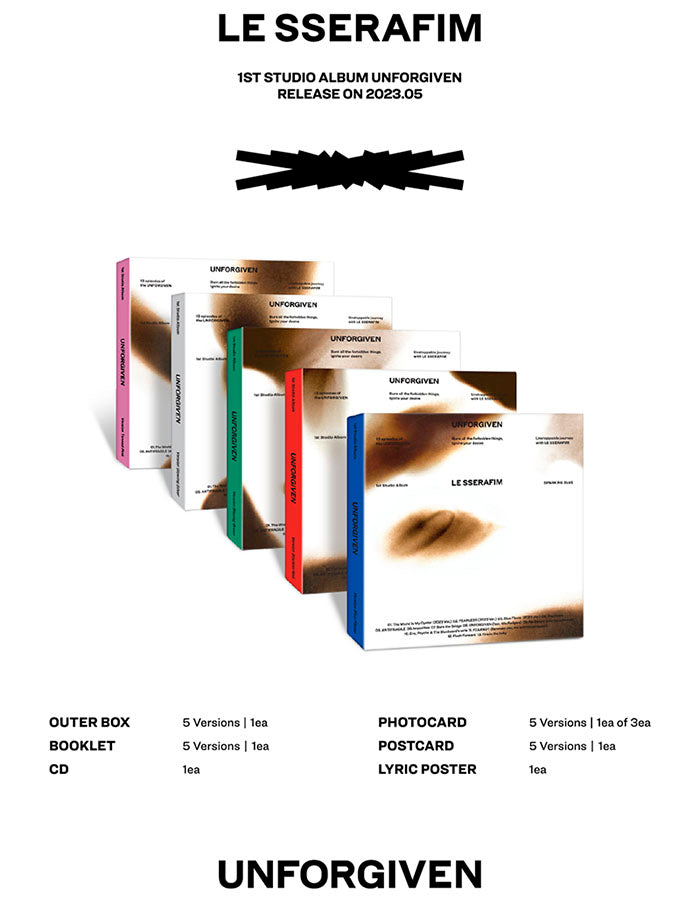 La versión compacta del primer álbum de estudio de Le Sserafim, «UNFORGIVEN» , está disponible en cinco versiones diferentes: Sparking Blue, Blackened Red, Blazuing Green, Glowing Silver y Tanned Pink.